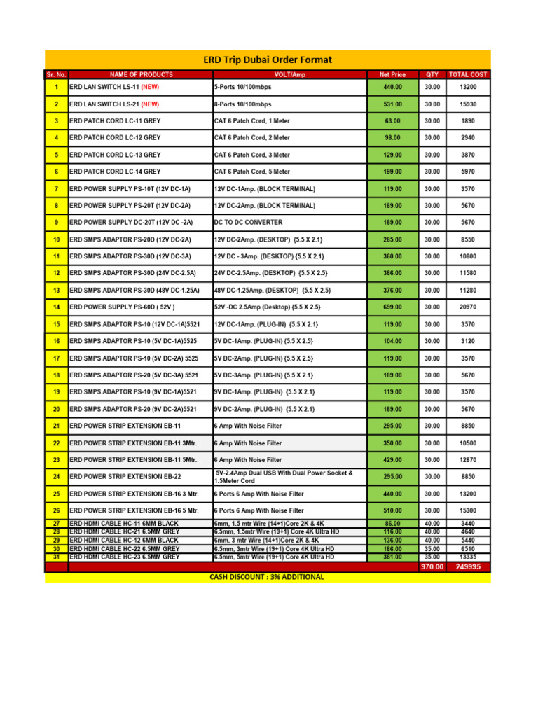 Sr. No. NAME OF PRODUCTS VOLT/Amp Net Price QTY TOTAL COST