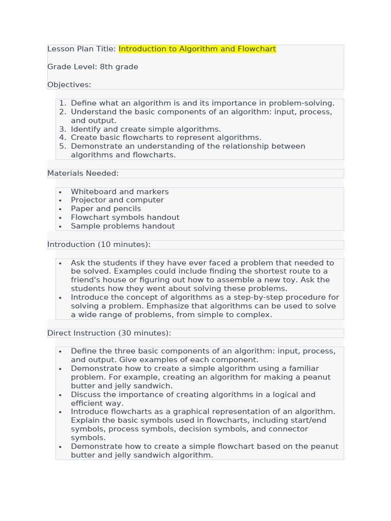 Lesson Plan Title: Introduction to Algorithm and Flowchart