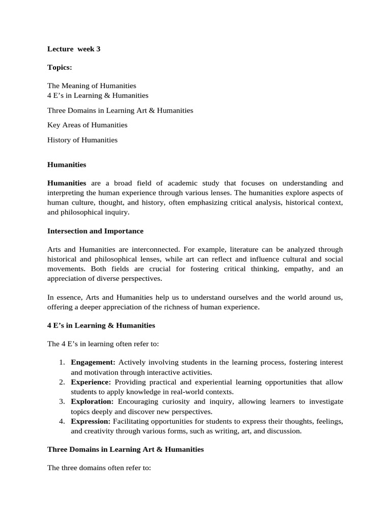 interpreting the human experience through various lenses. The humanities explore aspects of