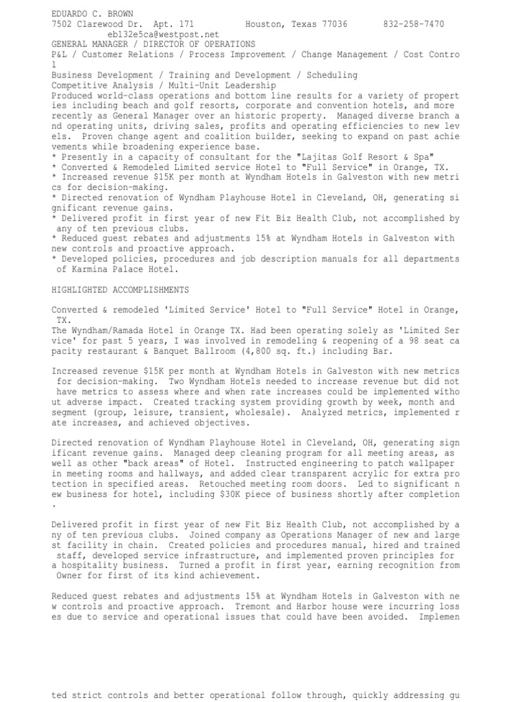 ted strict controls and better operational follow through, quickly addressing gu est needs and requirements. Reduced complaints significantly and lessened losse s in rebates and adjustments. Developed policies, procedures and job description manuals for all departments o f Karmina Palace Hotel. Hotel opened in 1997 and did not have any formal manual s on policies or department procedures. Over three month period, created compre hensive manuals detailing job descriptions, policies, procedures and check lists . For first time, hotel had descriptions for every position, policies for all d epartments, and passed with ease the next external audit. Reduced front office turnover 25% and improved guest comment scores 5% at Grand Bay Hotel. Joined hotel at a time when front office turnover was running at una cceptable rate. Unseasoned employees were dealing with wide variety of guest is sues for which they were not prepared. Implemented mandatory training for new s taff, instituted monthly meetings, and encouraged "Open Door" policy to discuss issues. Reduced turnover and improved morale. Created new strategy for Mardi Gras celebration at Wyndham, surpassing previous year's revenue by 10%. Hotel staged annual Mardi Gras event on premises, but ha d never achieved 100% occupancy during celebration. Expanded festivities to inc lude two locations for two events, one at the hotel and another in a large Ballr oom across the street. Achieved highly successful celebration, including 100% h otel occupancy and revenue beyond projections. EDUARDO C. BROWN PAGE 2 CAREER HISTORY Wyndham Worldwide Corporation - Progressively responsible operations positions f rom 2003 to 2008 with $4B global hotel and hospitality organization. The Wyndham Tremont Hotel & Harbor House, Served as General Manager for two hote ls, a beautiful historic property & a small boutique hotel, in Galveston, TX. W ith 161 rooms, from Jun. 2007 to Nov.2008. Managed all aspects of daily operati ons including business development, guest satisfaction, financial operations, ad ministration and special events. Controlled budgets to $8M and held full P&L... . Unfortunately, hotel was closed down due to major damages due to hurricane IKE . The Wyndham Cleveland Playhouse, Served as General Manager for this beautiful ho tel in the Theatre district Cleveland, OH. With 204 rooms, from Sep. 2006 to De c. 2006. Managed all aspects of daily operations including business development , guest satisfaction, financial operations, administration and special events. Controlled budgets to $6M and held full P&L.... It was understood that this was a temporary assignment while the company renegotiated the new management contrac t. The Wyndham Grand Bay Hotel, served as Rooms Operations Executive, in Manzanillo , Colima Mexico, a majestic beach & golf World class hotel & resort operation, w ith 200 rooms, from Dec. 2003 to Jun. 2007, Directed all facets of the hotel's R ooms division operations, including guest satisfaction, financial related operat ions, administration, & business development, including sales calls & presentati ons; Controlled $5M budget and up to 150 personnel.... was promoted to the Galve ston properties. The Karmina Palace Resort, served as Rooms Executive / Quality Control Manager, in a World-class hotel and resort operation. With 324 rooms, from Feb. 2000 to directed all facets of the Rooms Division operations. Created manuals detailing