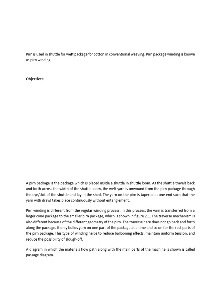 Pirn is used in shuttle for weft package for cotton in conventional weaving. Pirn package winding is known