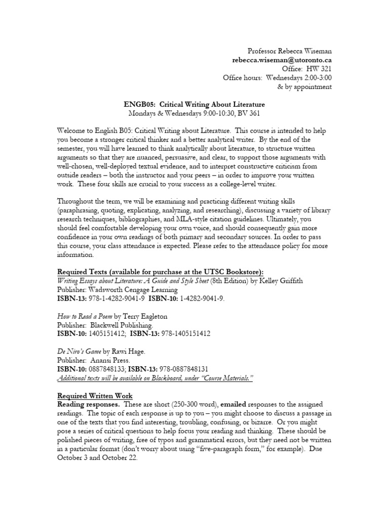 Welcome to English B05: Critical Writing about Literature. This course is intended to help