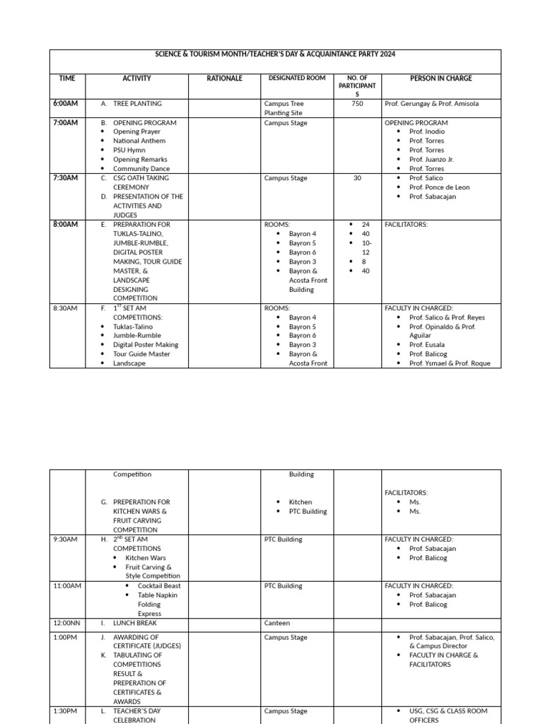 TIME ACTIVITY RATIONALE DESIGNATED ROOM NO. OF PERSON IN CHARGE