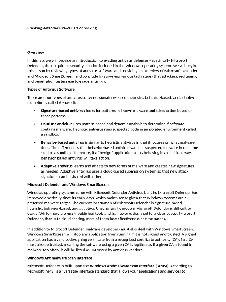 In this lab, we will provide an introduction to evading antivirus defenses - specifically Microsoft