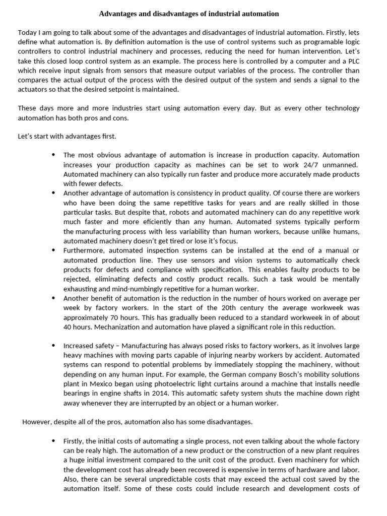 Today I am going to talk about some of the advantages and disadvantages of industrial automation. Firstly, lets