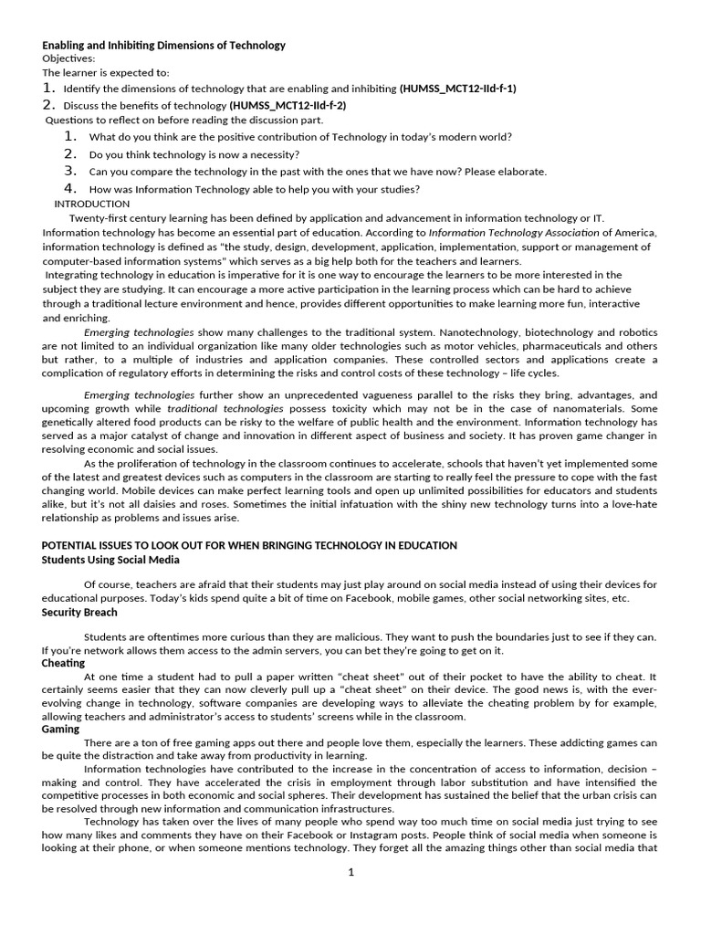 1. Identify the dimensions of technology that are enabling and inhibiting (HUMSS_MCT12-IId-f-1)
