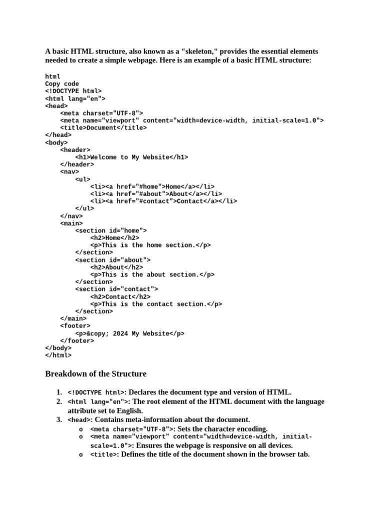 A basic HTML structure, also known as a "skeleton," provides the essential elements