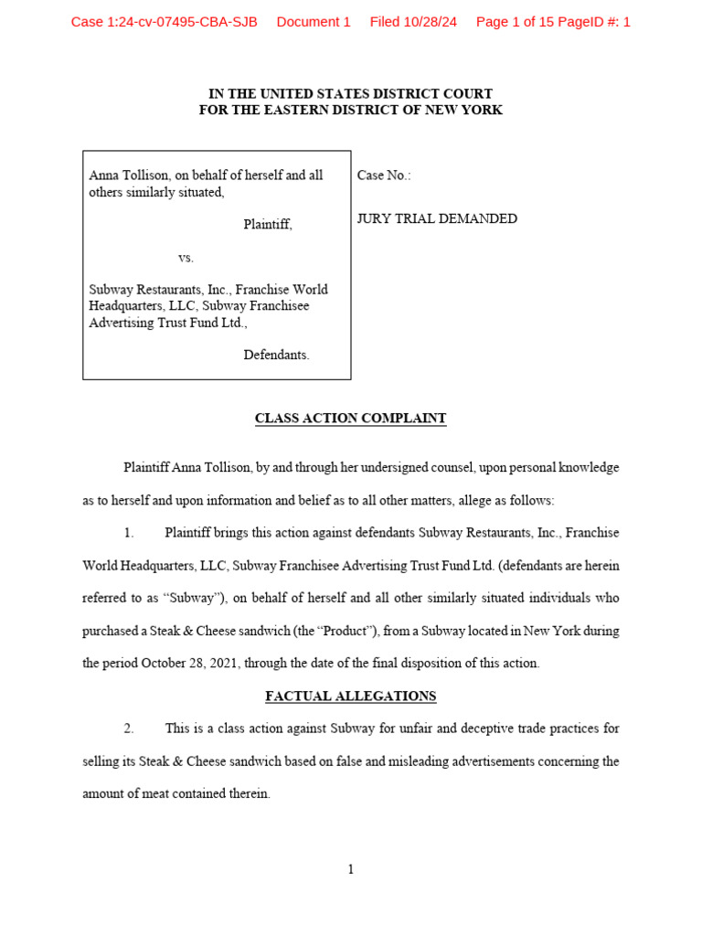 1. Plaintiff brings this action against defendants Subway Restaurants, Inc., Franchise