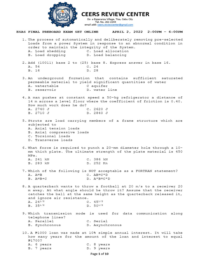 ESAS FINAL PREBOARD EXAM SET ONLINE APRIL 2, 2022 2:00PM – 6:00PM