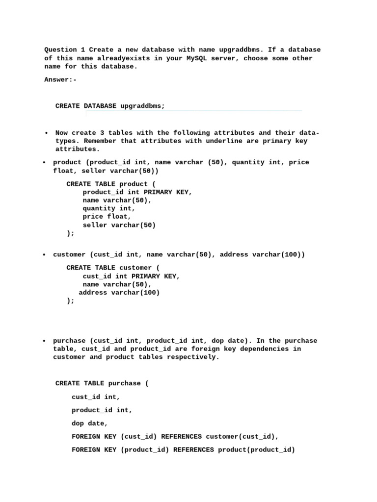 • purchase (cust_id int, product_id int, dop date). In the purchase