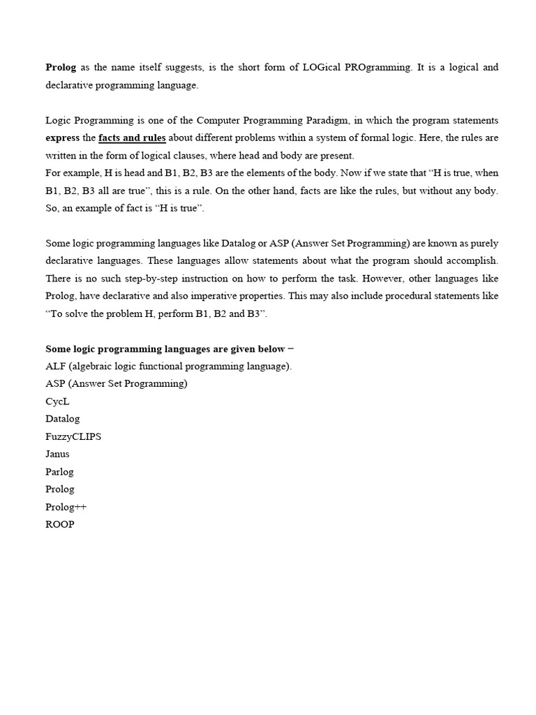 Prolog or PROgramming in LOGics is a logical and declarative programming language. It is one major