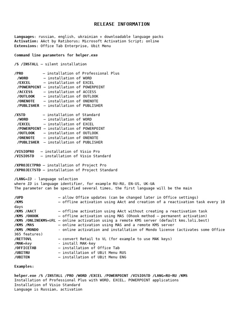 helper.exe /S /INSTALL /XSTD /WORD /LANG=RU-RU /LANG=EN-US /UPD /KMS /OHOOK