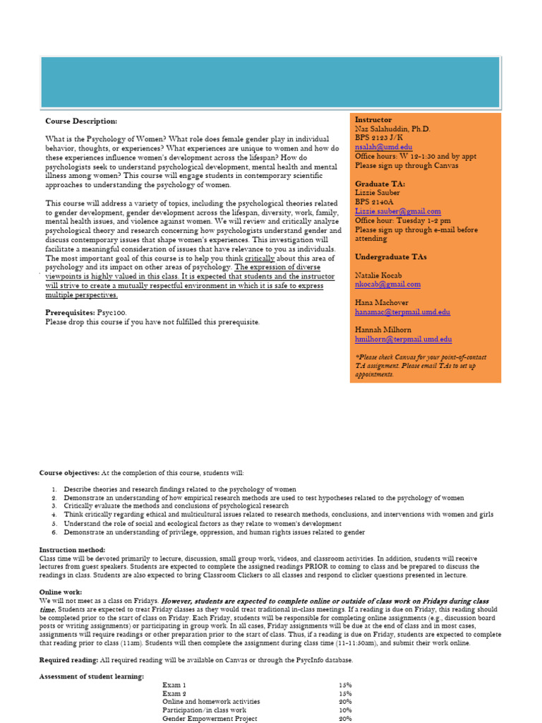 4. Current event reaction paper (2-3 pages): Write about a current event and how it relates to the psychology of women. Be sure to indicate why