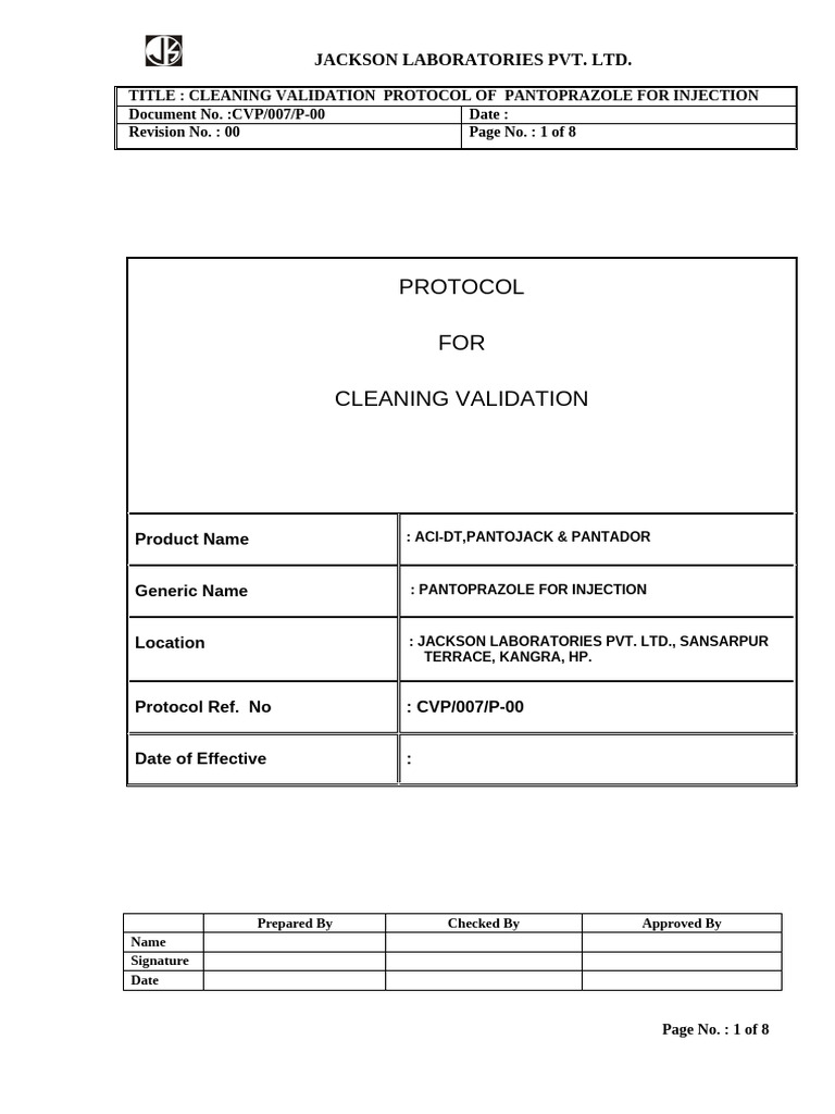 TITLE : CLEANING VALIDATION PROTOCOL OF PANTOPRAZOLE FOR INJECTION
