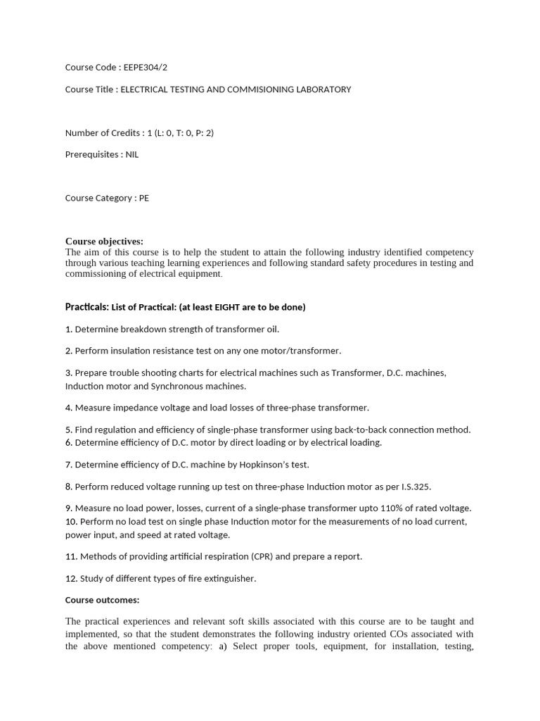 Course Title : ELECTRICAL TESTING AND COMMISIONING LABORATORY