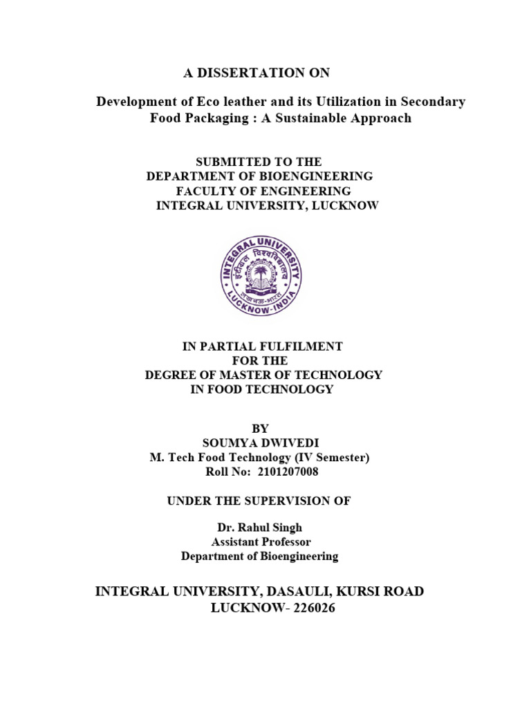 Sustainable Approach” for the award of M.Tech Food Technology from Integral University,
