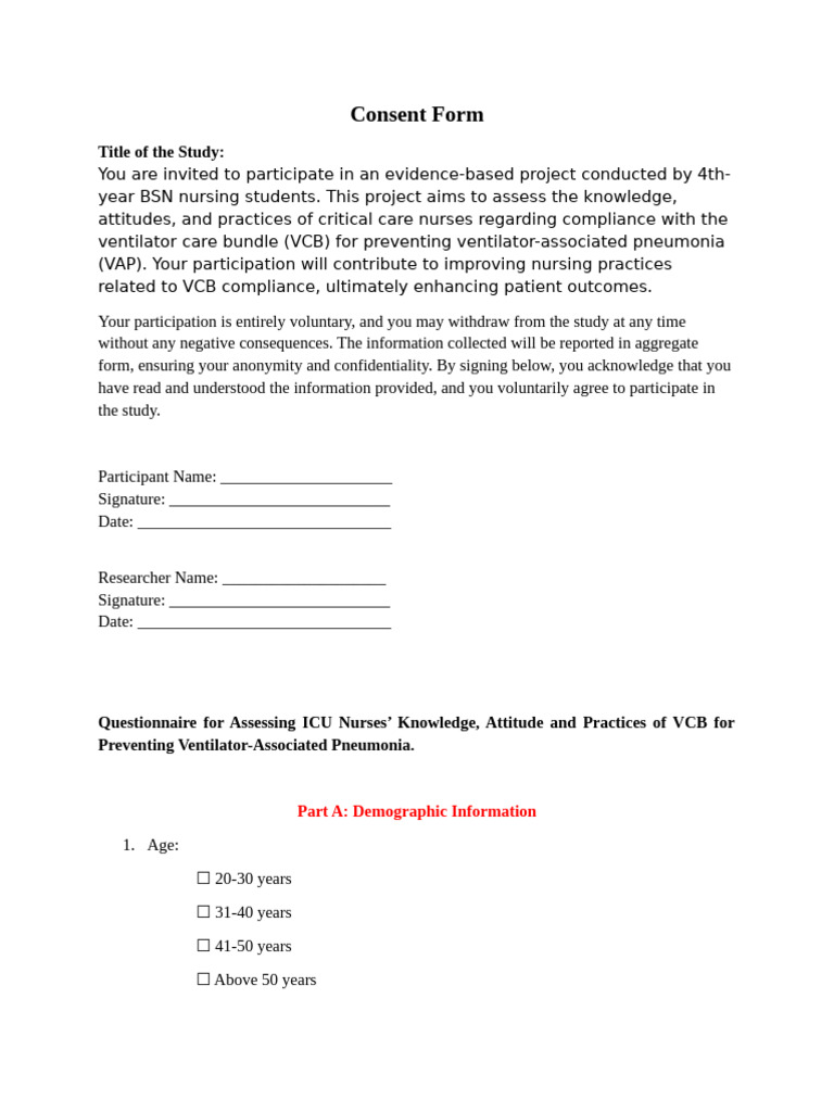 Questionnaire for Assessing ICU Nurses’ Knowledge, Attitude and Practices of VCB for