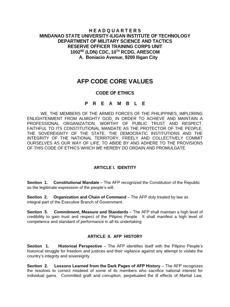 Section 1. The AFP Core Values – The Profession of arms, noble callings, and demands