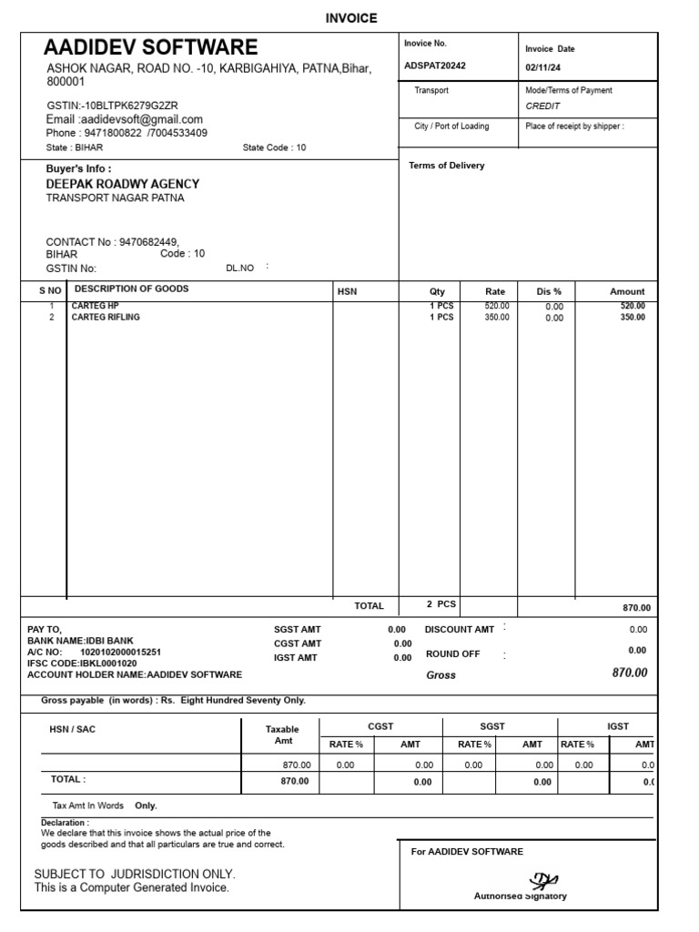 AADIDEV SOFTWARE Inovice No.
