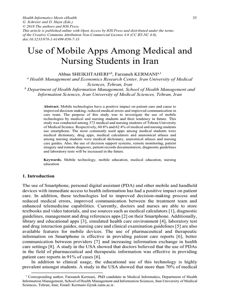 A. Sheikhtaheri and F. Kermani / Use of Mobile Apps Among Medical and Nursing Students in Iran 35