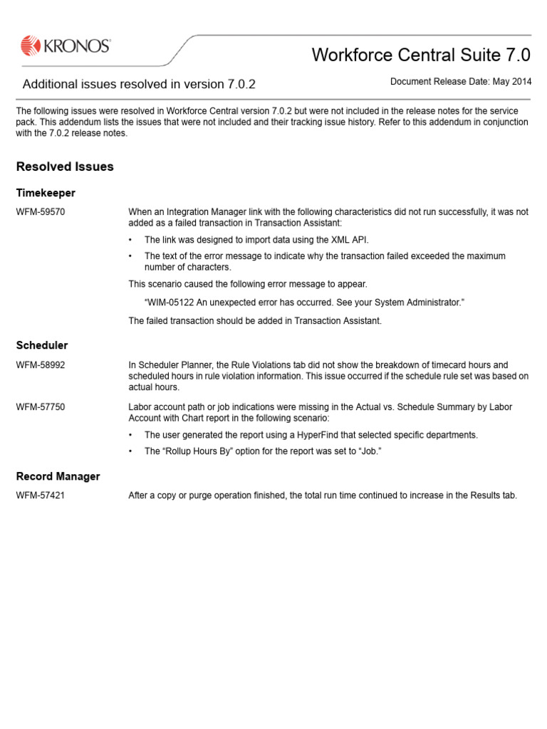 The following issues were resolved in Workforce Central version 7.0.2 but were not included in the release notes for the service