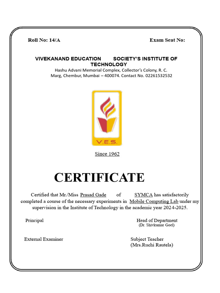 completed a course of the necessary experiments in Mobile Computing Lab under my