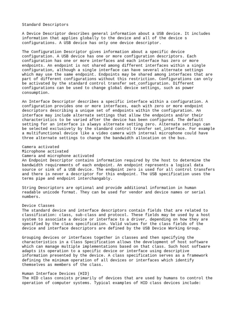 “alternate settings”. Interfaces may be standardized by USB “Class” specifications,