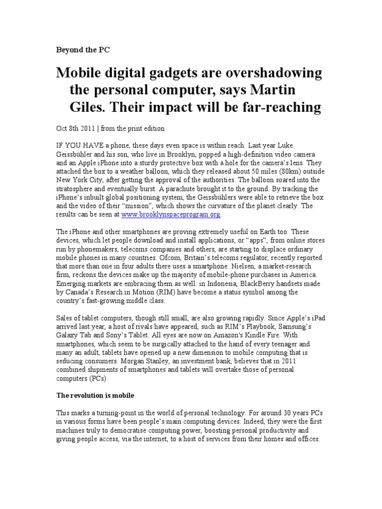 Oct 8th 2011 | from the print edition IF YOU HAVE a phone, these days even space is within reach. Last year Luke Geissbhler and his son, who live in Brooklyn, popped a high-definition video camera and an Apple iPhone into a sturdy protective box with a hole for the cameras lens. They attached the box to a weather balloon, which they released about 50 miles (80km) outside New York City, after getting the approval of the authorities. The balloon soared into the stratosphere and eventually burst. A parachute brought it to the ground. By tracking the iPhones inbuilt global positioning system, the Geissbhlers were able to retrieve the box and the video of their mission, which shows the curvature of the planet clearly. The results can be seen at www.brooklynspaceprogram.org. The iPhone and other smartphones are proving extremely useful on Earth too. These devices, which let people download and install applications, or apps, from online stores run by phonemakers, telecoms companies and others, are starting to displace ordinary mobile phones in many countries. Ofcom, Britains telecoms regulator, recently reported that more than one in four adults there uses a smartphone. Nielsen, a market-research firm, reckons the devices make up the majority of mobile-phone purchases in America. Emerging markets are embracing them as well: in Indonesia, BlackBerry handsets made by Canadas Research in Motion (RIM) have become a status symbol among the countrys fast-growing middle class. Sales of tablet computers, though still small, are also growing rapidly. Since Apples iPad arrived last year, a host of rivals have appeared, such as RIMs Playbook, Samsungs Galaxy Tab and Sonys Tablet. All eyes are now on Amazon's Kindle Fire. With smartphones, which seem to be surgically attached to the hand of every teenager and many an adult, tablets have opened up a new dimension to mobile computing that is seducing consumers. Morgan Stanley, an investment bank, believes that in 2011 combined shipments of smartphones and tablets will overtake those of personal computers (PCs). The revolution is mobile This marks a turning-point in the world of personal technology. For around 30 years PCs in various forms have been peoples main computing devices. Indeed, they were the first machines truly to democratise computing power, boosting personal productivity and giving people access, via the internet, to a host of services from their homes and offices.