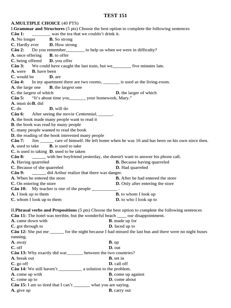 II.Phrasal verbs and Prepositions (5 pts) Choose the best option to complete the following sentences
