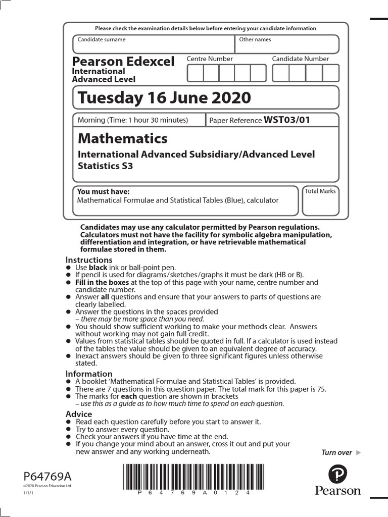 booklet ‘Mathematical Formulae and Statistical Tables’ is provided.
