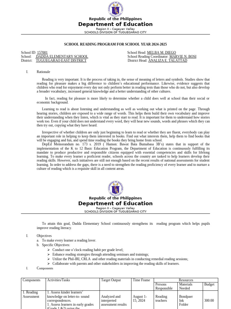 SCHOOL READING PROGRAM FOR SCHOOL YEAR 2024-2025
