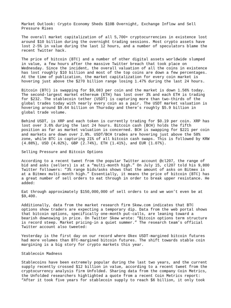 Market Outlook: Crypto Economy Sheds $10B Overnight, Exchange Inflow and Sell
