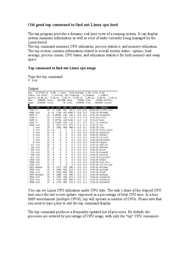 The top program provides a dynamic real-time view of a running system. It can display system summary information as well as a list of tasks currently being managed by the Linux kernel. The top command monitors CPU utilization, process statistics, and memory utilization. The top section contains information related to overall system status - uptime, load average, process counts, CPU status, and utilization statistics for both memory and swap space. Top command to find out Linux cpu usage Type the top command: