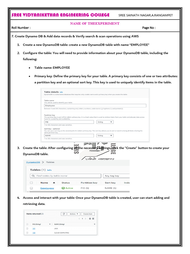 7. Create Dynamo DB & Add data records & Verify search & scan operations using AWS