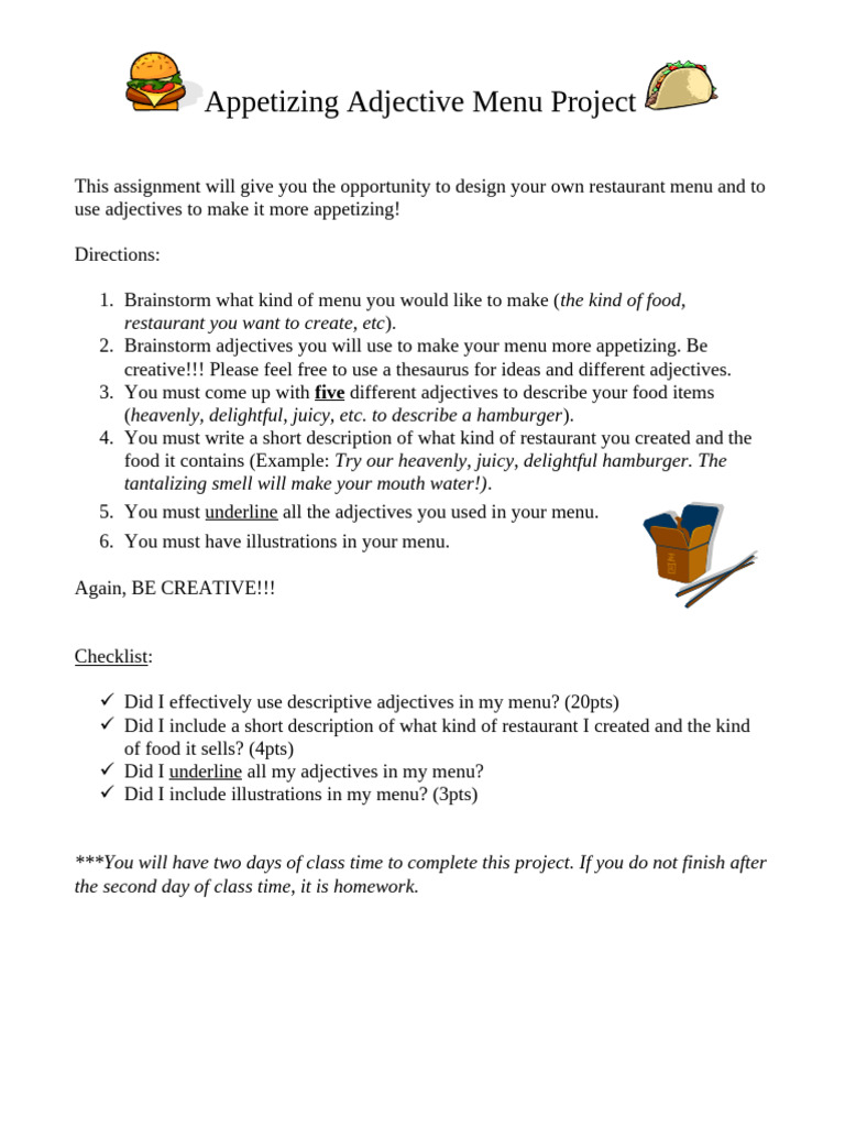 2. Brainstorm adjectives you will use to make your menu more appetizing. Be