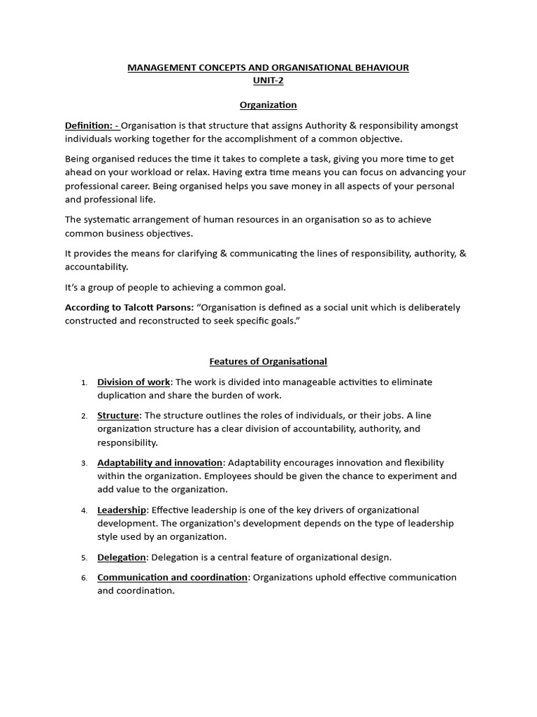 According to Talcott Parsons: “Organisation is defined as a social unit which is deliberately