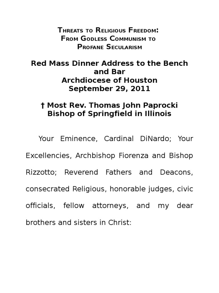 THREATS TO RELIGIOUS FREEDOM: FROM GODLESS COMMUNISM TO PROFANE SECULARISM Red Mass Dinner Address to the Bench and