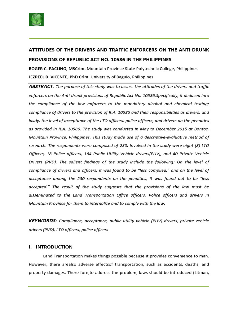 Attitudes of The Drivers and Traffic Enforcers On The Anti-Drunk Provisions of Republic Act No. 10586 in The Philippines