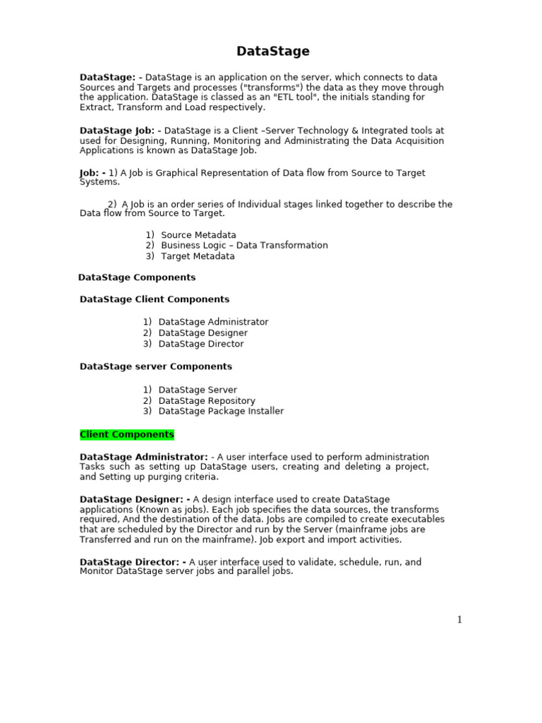 DataStage Server: - Runs executable jobs that extract, transform, and load