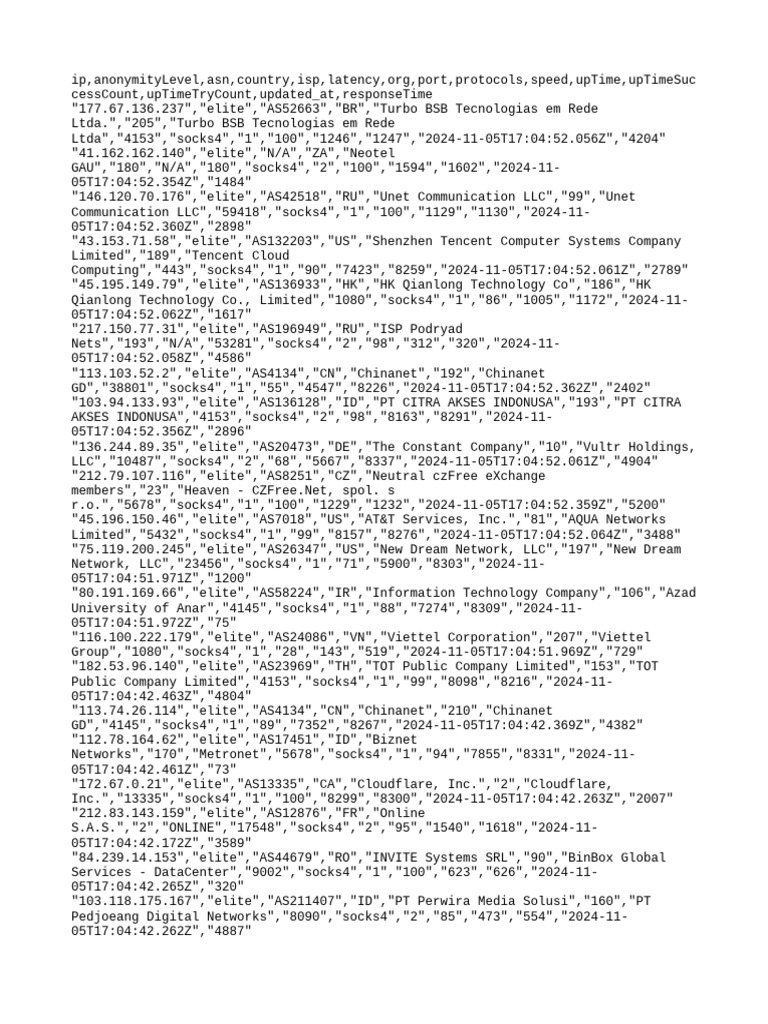 ip,anonymityLevel,asn,country,isp,latency,org,port,protocols,speed,upTime,upTimeSuc