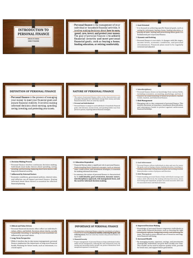 informed decisions about earning, spending, • Personal finance is unique to each individual or household. Financial involves decisions on insurance, investment diversification,