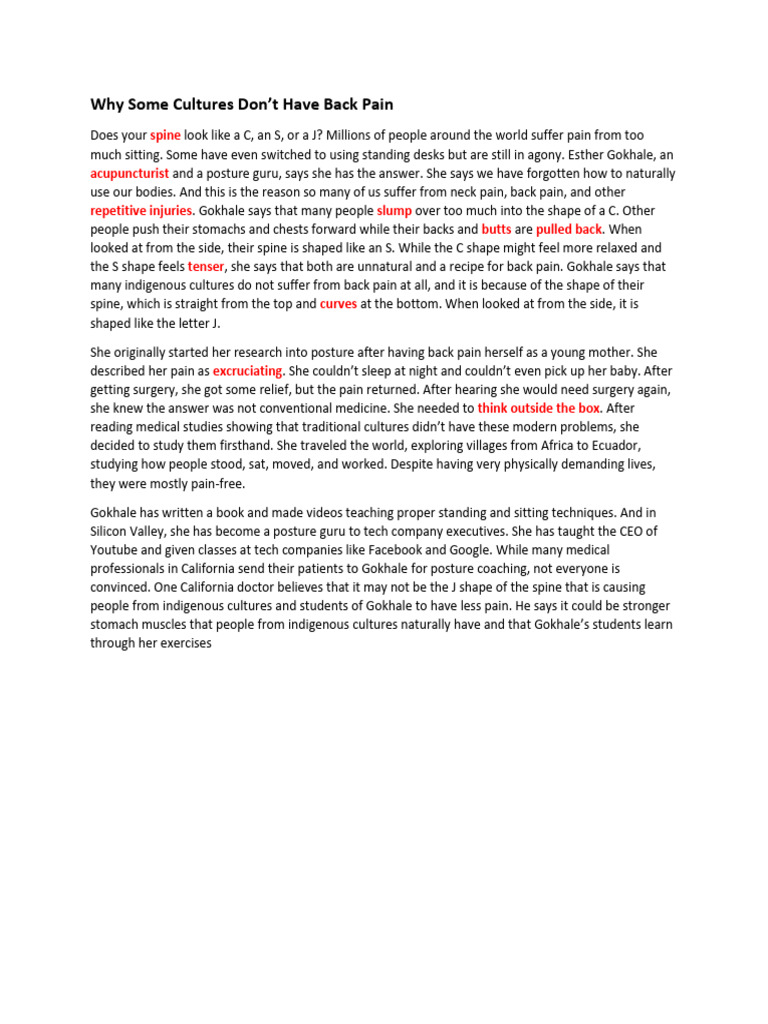 repetitive injuries. Gokhale says that many people slump over too much into the shape of a C. Other