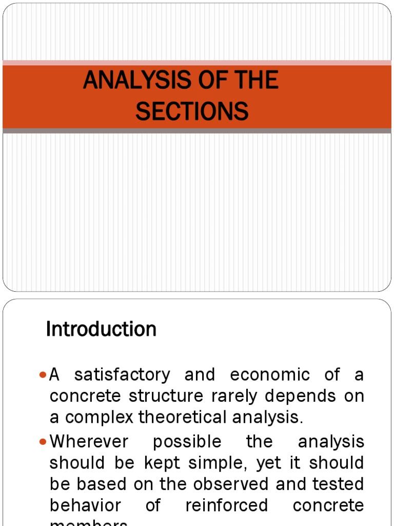 concrete structure rarely depends on a complex theoretical analysis. Wherever possible the analysis should be kept simple, yet it should be based on the observed and tested behavior of reinforced concrete members.