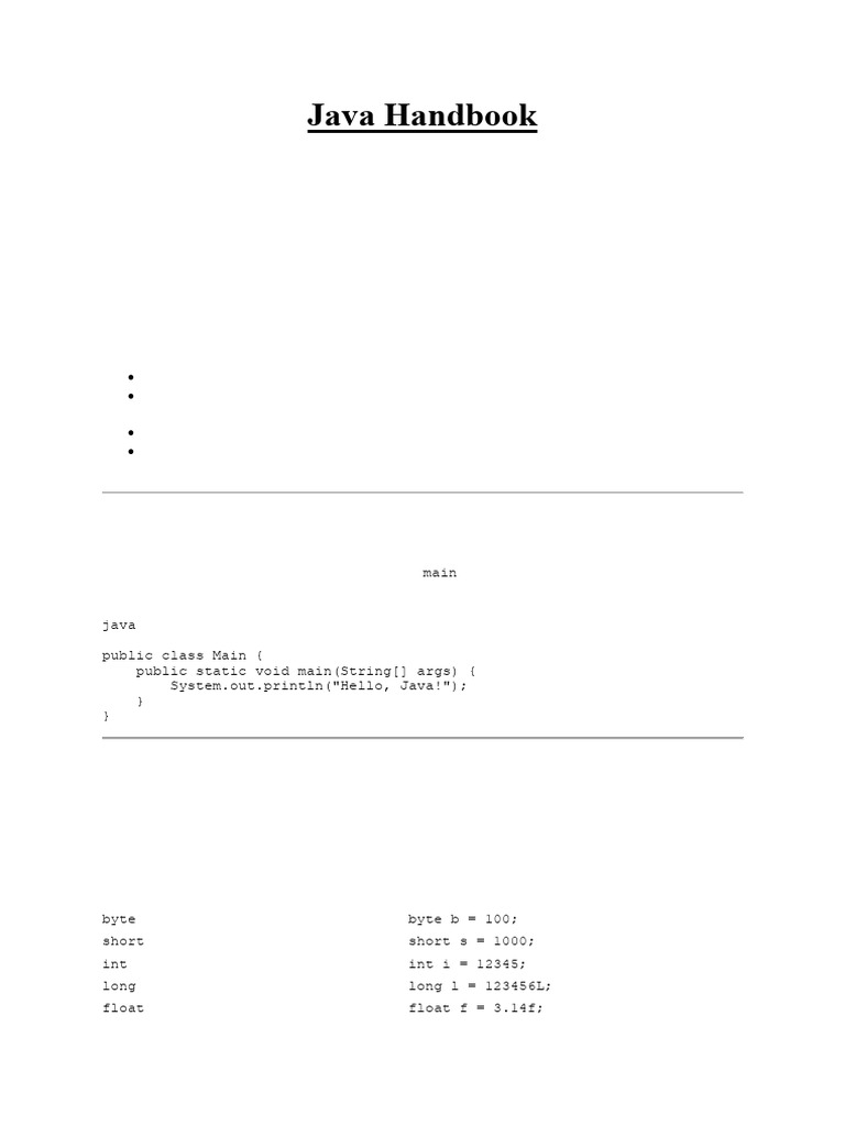 This handbook provides a summary of Java’s foundational elements, from syntax and OOP