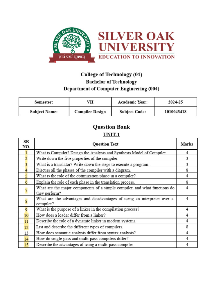 Subject Name: Compiler Design Subject Code: 1010043418