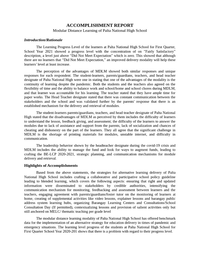 The school officer-in-charge shows leadership skills by crafting the BE-LCP however, due to