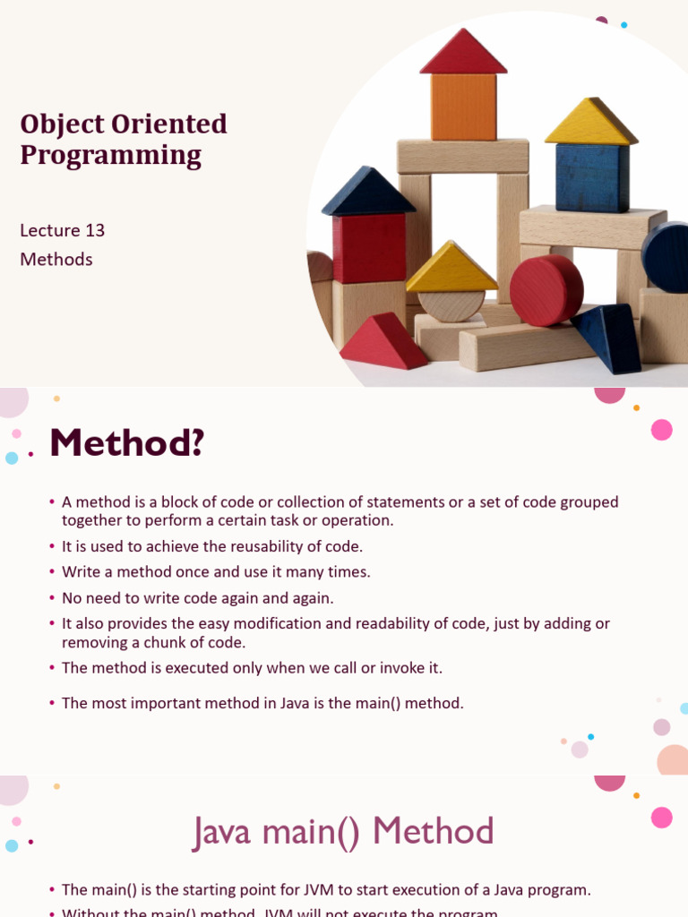 o Methods can accept parameters, allowing the passing of data and facilitating