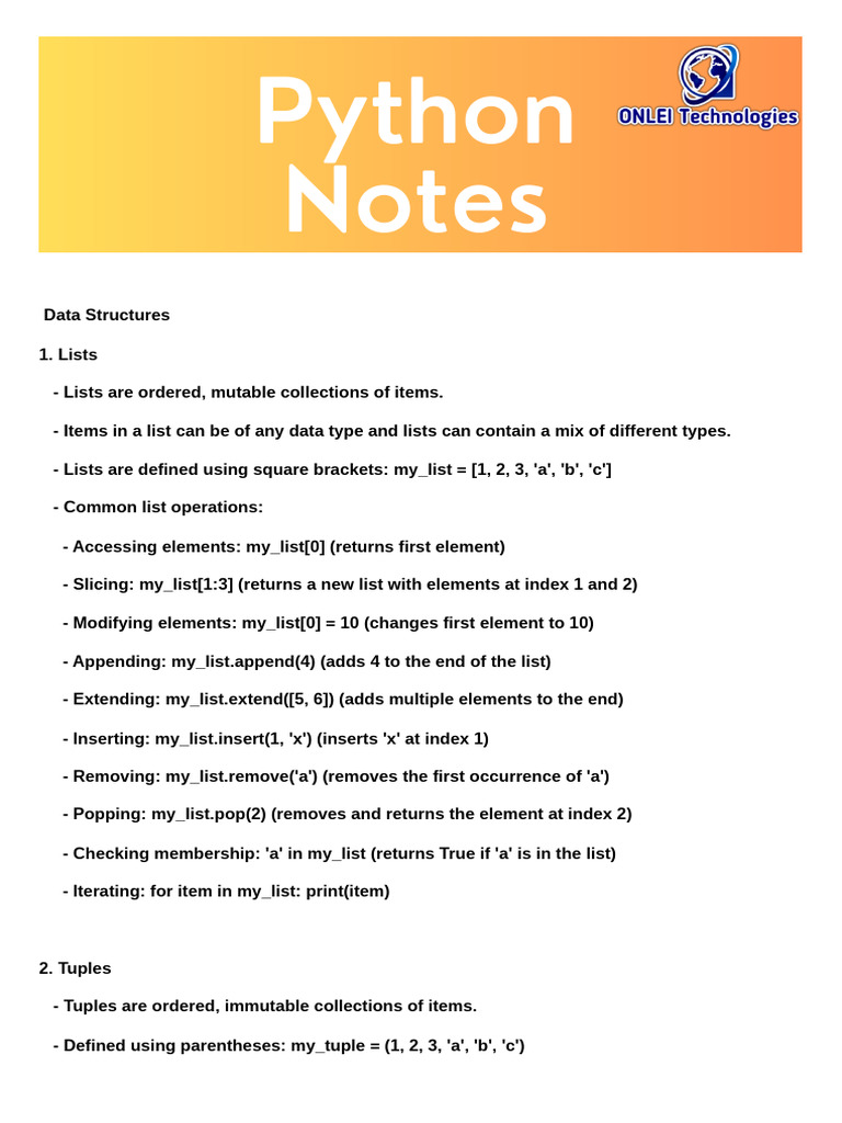 - Slicing: my_list[1:3] (returns a new list with elements at index 1 and 2)