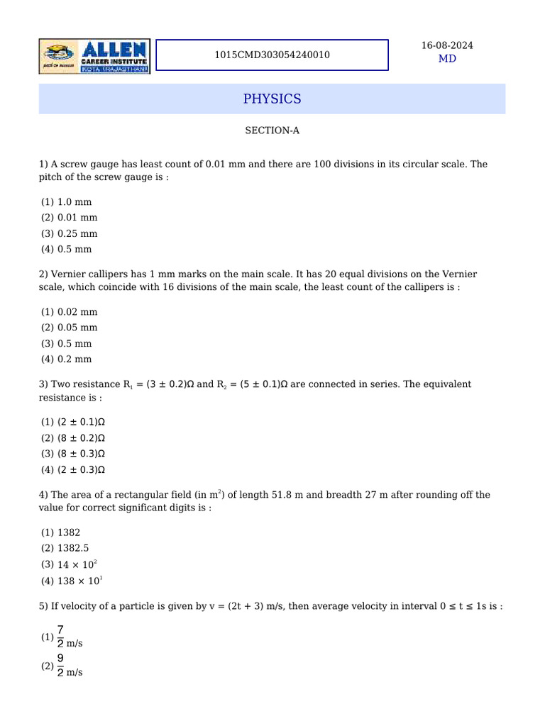 1) A screw gauge has least count of 0.01 mm and there are 100 divisions in its circular scale. The