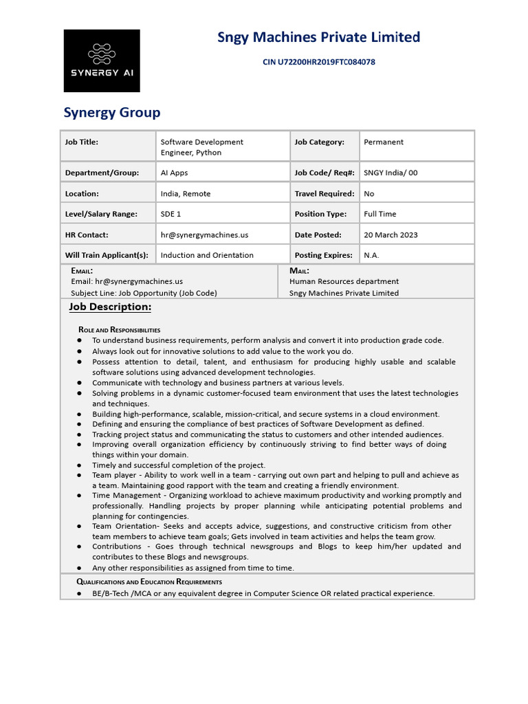 HR Contact: hr@synergymachines.us Date Posted: 20 March 2023
